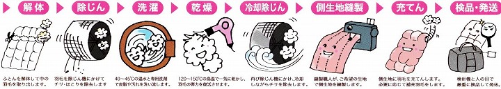 当店ではせっかくのリフォームを機に、除塵後に汗や臭い、ダニの残骸などもスッキリ洗い流す、羽毛の完全洗浄工程を含む最も丁寧で衛生的なリフォーム方法を採用しています。